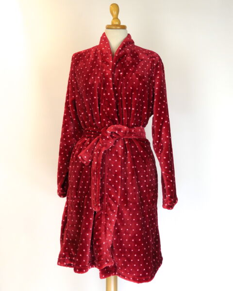 Morgenmantel in der Fare Rot mit weissen Tupfen, Grösse 40, kuschelig aus weichem Plüsch und Gürtel zum binden.